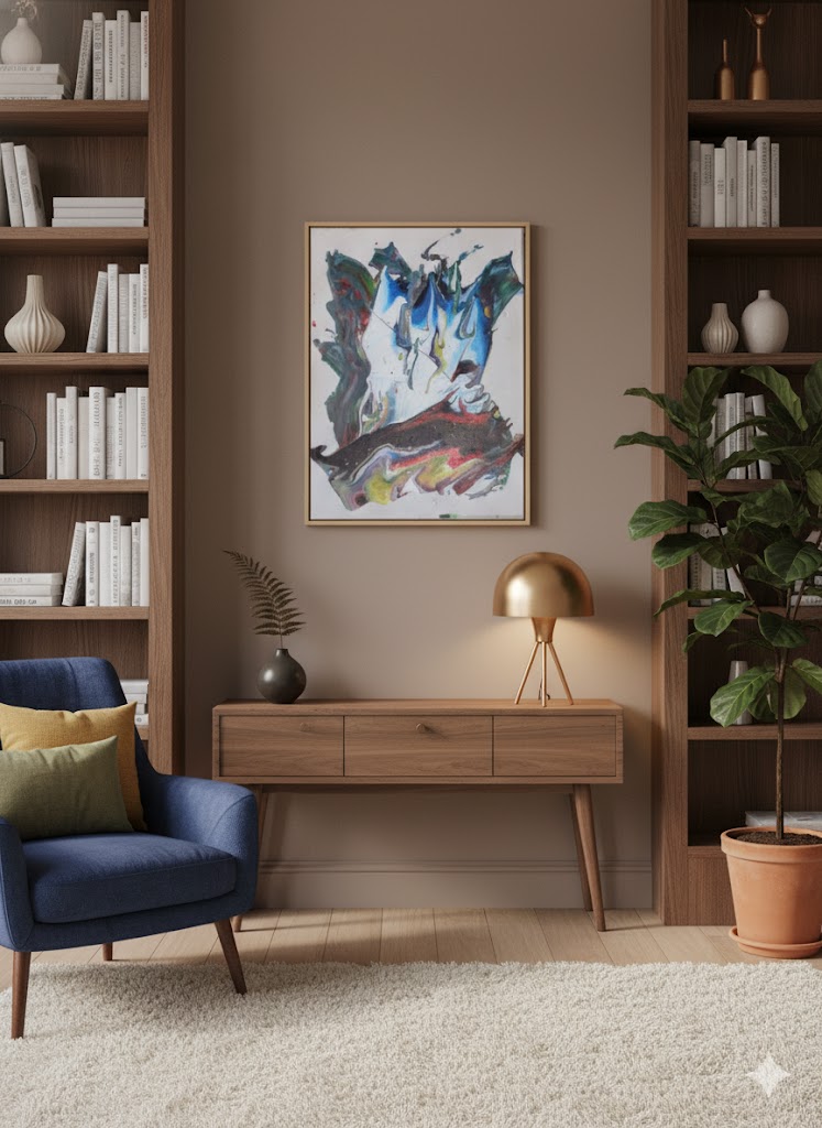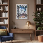 La large forme sombre au centre symbolise son ancien corps calciné, encore marqué par le feu qui l’a consumé. Autour, les éclats de rouge, de jaune et de bleu traduisent l’intensité des flammes de la résurrection, contrastant avec le blanc et le bleu qui évoquent la lumière et la pureté du renouveau. Le mouvement fluide des couleurs donne une impression de puissance et de libération, comme si l’oiseau s’élevait dans un dernier souffle incandescent.